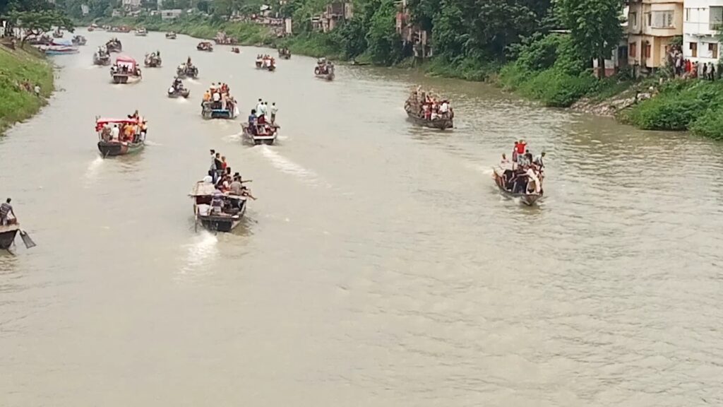 নওগাঁ প্রতিনিধি : নওগাঁয় ছোট যমুনা নদীতে নৌ শোভাযাত্রার মধ্য দিয়ে এ বছর প্রতিমা বিসর্জন দেয়া হয়েছে। বৃহস্পতিবার বিকেলে প্রতিমা বিসর্জন উৎসবে পাঁচ শতাধিক নৌকা অংশ নিতে দেখা যায়। নওগাঁ শহরের মাঝ দিয়ে বয়ে যাওয়া ছোট যমুনা নদীর বিজিবি ব্রিজ থেকে পালপাড়া ব্রিজ পর্যন্ত প্রায় ৩ কিলোমিটার অংশ জুড়ে দুর্গাপূজার প্রতিমা বিসর্জনের দিন এমন নৌ শোভাযাত্রার আয়োজন করা হয় প্রতি বছর। এই শোভাযাত্রায় নওগাঁ পৌরসভা, সদর উপজেলাসহ জেলার বিভিন্ন উপজেলা ও বিভিন্ন এলাকার মণ্ডপ থেকে আসা প্রতিমাবাহী নৌকা ছাড়াও ব্যক্তিগত, পারিবারিক এবং বিভিন্ন সংগঠনের নৌকা এই শোভাযাত্রায় অংশ নিয়েছে এবার। বিকেল তিনটার পর থেকে নদীর বুকে ছুটে চলা নৌকায় ঢাকের শব্দ এবং মাইকের গানের আওয়াজে মুখরিত হয়ে উঠে তিন কিলোমিটার এলাকা। নদীর দুই পাড়ে দাঁড়িয়ে সব ধর্মের নারী-পুরুষ, শিশু, কিশোর এ দৃশ্য উপভোগ করেন। নৌ শোভাযাত্রা শেষে সন্ধ্যায় ছোট যুমনা নদীর দহের ঘাটে প্রতিমা বিসর্জন দেয়া হয়। আর তার মধ্য দিয়েই শেষ হলো সনাতন ধর্মাবলম্বীদের সবচেয়ে বড় ধর্মীয় উৎসব শারদীয় দুর্গা পূজা। এর আগে দুপুরের পর থেকেই নওগাঁ সদরসহ জেলার বিভিন্ন উপজেলার পূজা মণ্ডপে দেবীর পায়ে সিঁদুর ছোঁয়ার পর শুরু হয় ভক্তদের সিঁদুর খেলা। হিন্দু ধর্মাবলম্বী নারীরা একে অন্যকে রাঙিয়ে দেন সিঁদুরের লাল রঙে। চলে ছবি তোলা আর ঢাকের তালে নাচ-গান। প্রতিমা বিসর্জন উপলক্ষে ছোট যমুনা নদীর দুই পাড়সহ শহরজুড়ে নেয়া হয় কঠোর নিরাপত্তা ব্যবস্থা।শান্তিপূর্ণভাবেই এ বছর শেষ হলো শারদীয় দুর্গোৎসব। এ বছর জেলার ১১টি উপজেলায় মোট ৮০১টি পূজামণ্ডপে শারদীয় দুর্গাপূজা অনুষ্ঠিত হয়েছে। পঞ্জিকা মতে, এবার দেবী দুর্গা গজে (হাতি) চড়ে মর্ত্যে আগমন করেছেন শান্তির প্রতীক। আর ফিরতি যাত্রায় দেবী দোলায় (পালকিতে) চড়ে কৈলাশে গমন করবেন, যা শুভ লক্ষণ হিসেবেই গণ্য করা হয়।